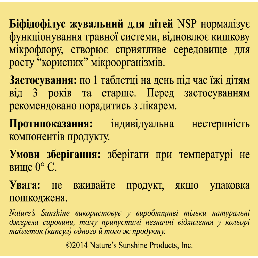 Склад адаптований для дітей віком від 3 років. Продукт представлений у вигляді жувальних таблеток із натуральним апельсиновим ароматом. Містить не лише про-, а і пребіотики.