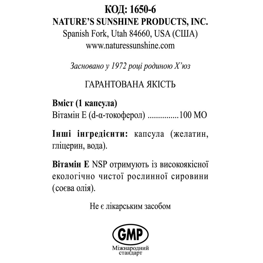 Чистий вітамін Е, представлений у його найбільш активній формі та оптимальному для застосування дозуванні — 100 МО (100 мкг). Виробляється з натуральних рослинних олій.